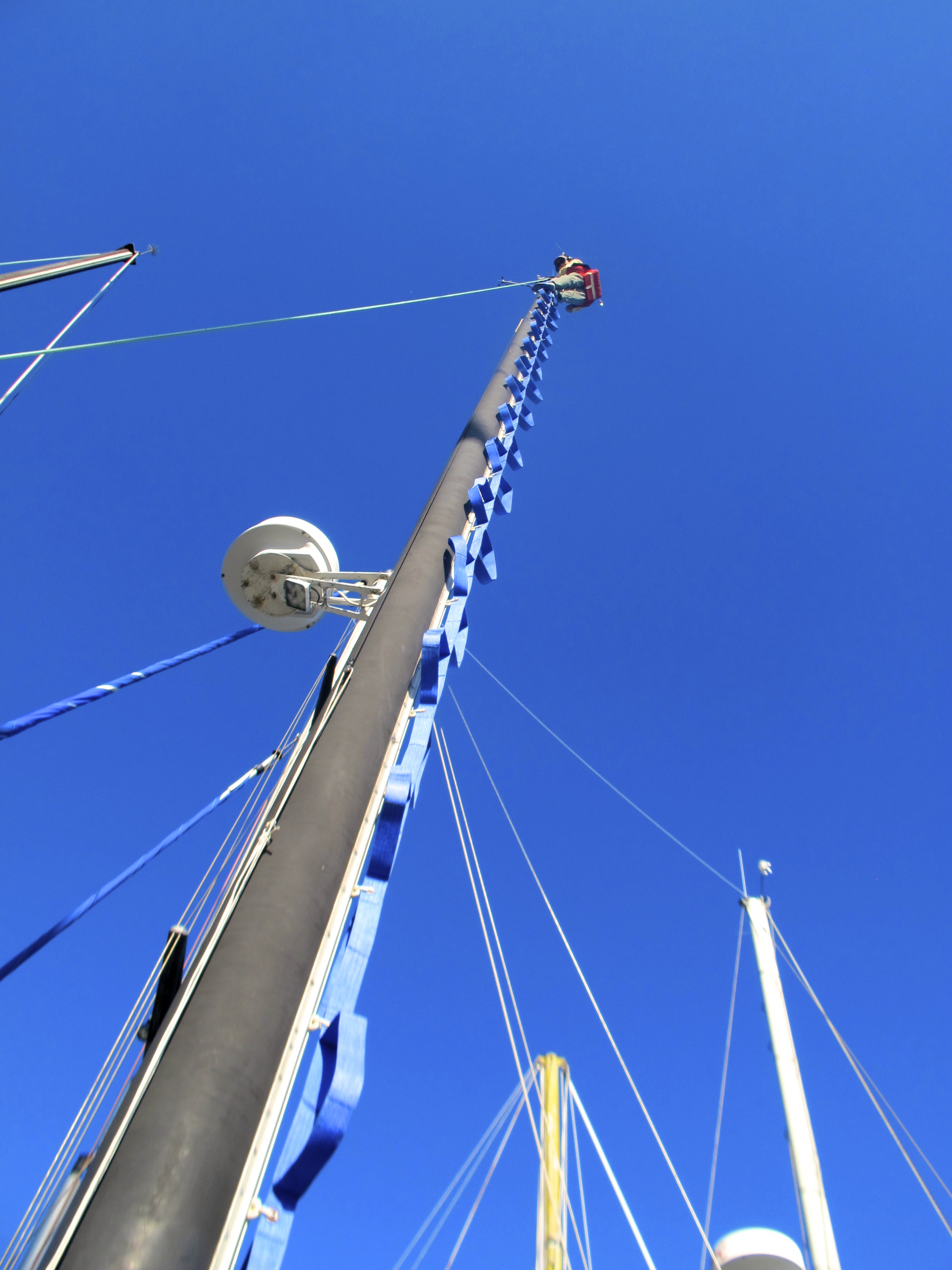 Before we could attach the sails & covers back on the booms, I had to hoist Frank to the top of the mast using the electric winch so that he could install a new tri-light. Once at the top, he discovered the rope sheave that allows the sail to be pulled up the mast was broken, so that required him being let down and then hoisted back up with a new one.