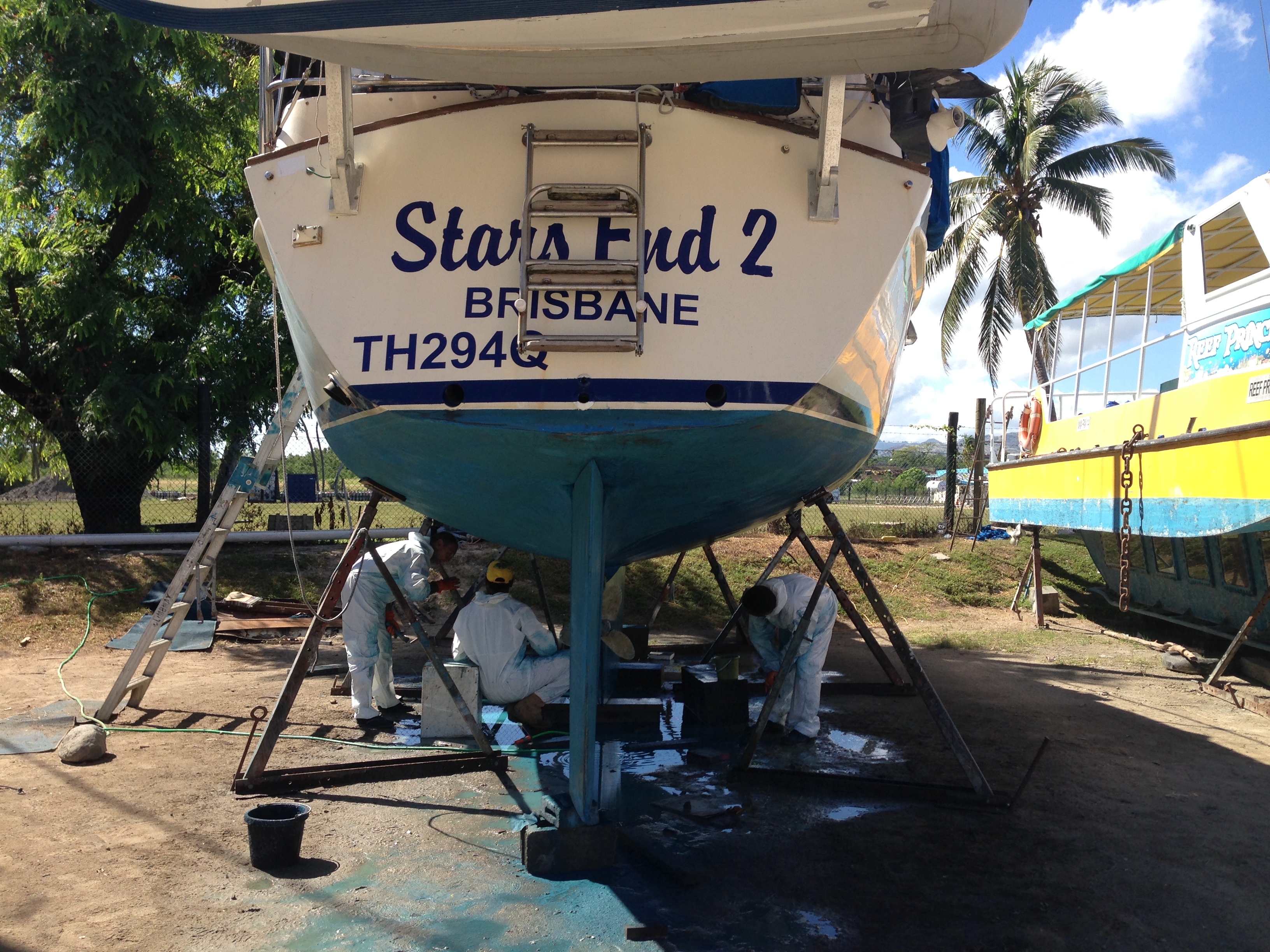 We spent four long, hard days of work sanding back the keel, filling some bad gouges in the fiberglass after running aground on reefs a couple of times last year, and then we repainted with anti fouling paint. On one day, we hired marina workers Luke & Russi, to help wet & dry sand the entire hull prior to painting.