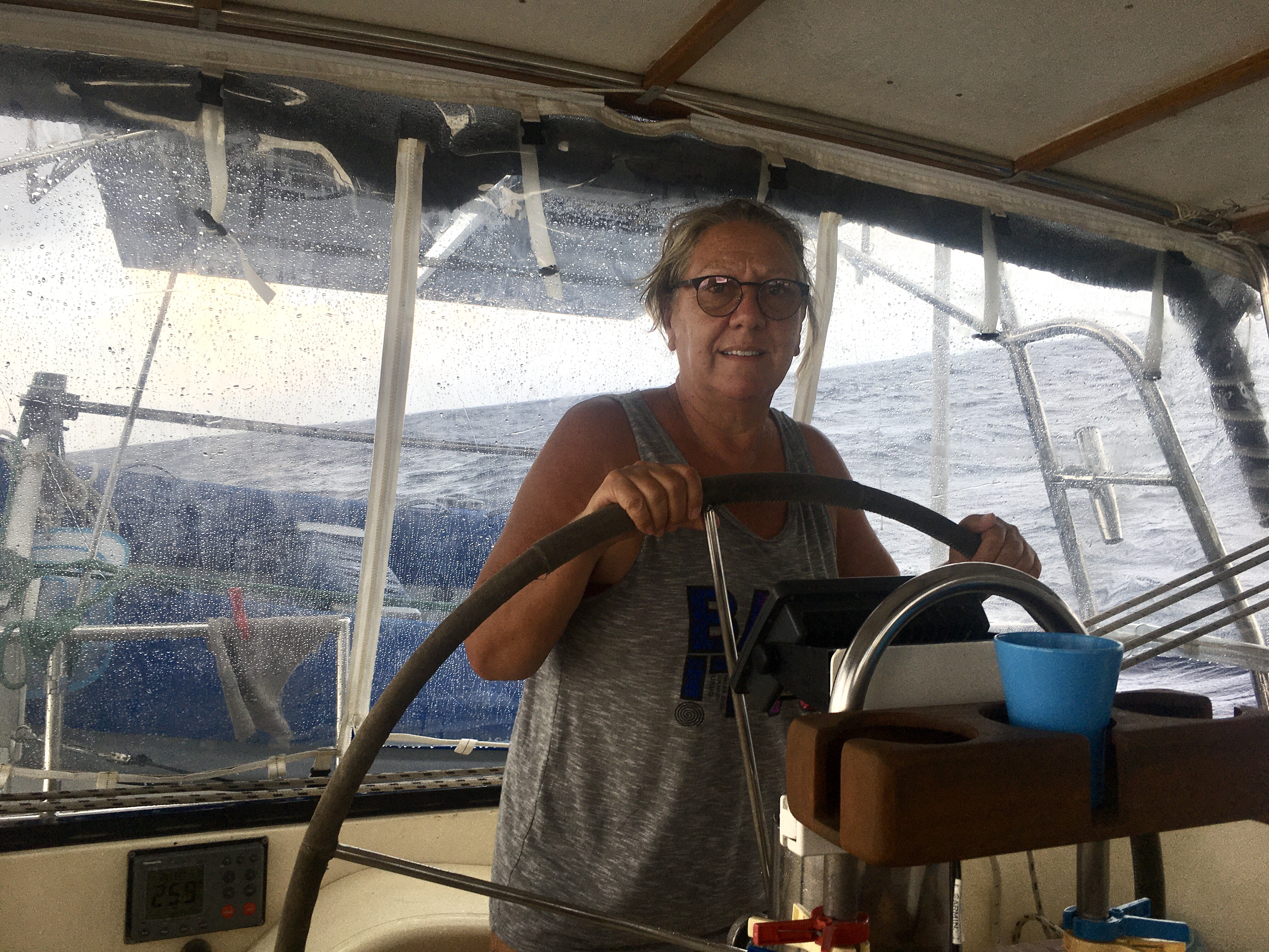 We didn’t have time to reflect on this for too long as we hit a squall soon after, bringing the first rain we’d seen in months. Despite little sail out, I saw the speedo hit 9.8 knots several times and with grey skies looming on the horizon, we dropped the mizzen sail completely and continued on our course. With heavy rain showers descending upon us to make conditions uncomfortably wet overnight but at least we filled up two jerry cans of fresh water to top up our tanks.