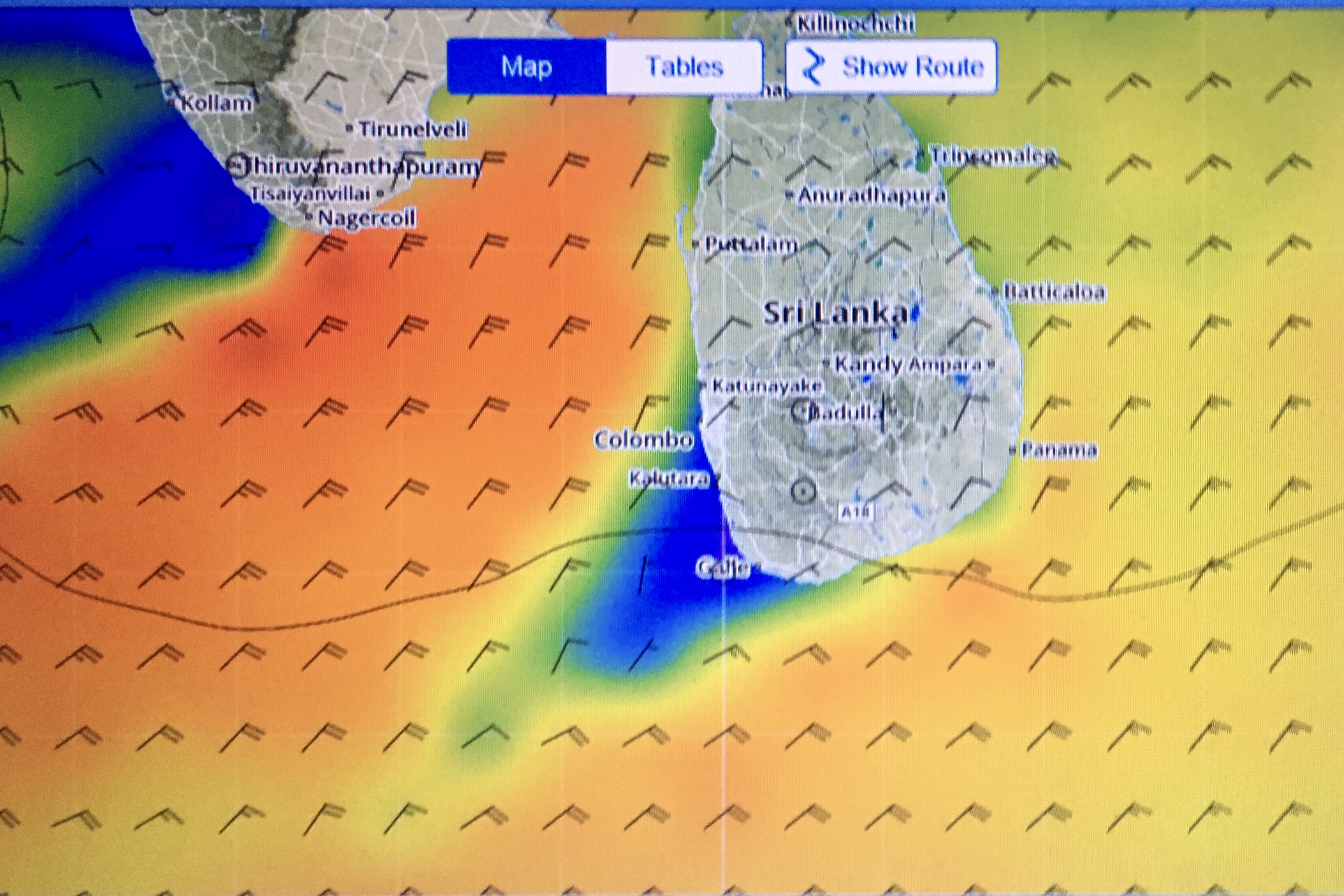 So now we worked out a strategy to reduce sail to slow down our progress, hug the coast of south west Sri Lanka and try to stay in the lee of the island which was more protected from the strong winds until the worst had passed.