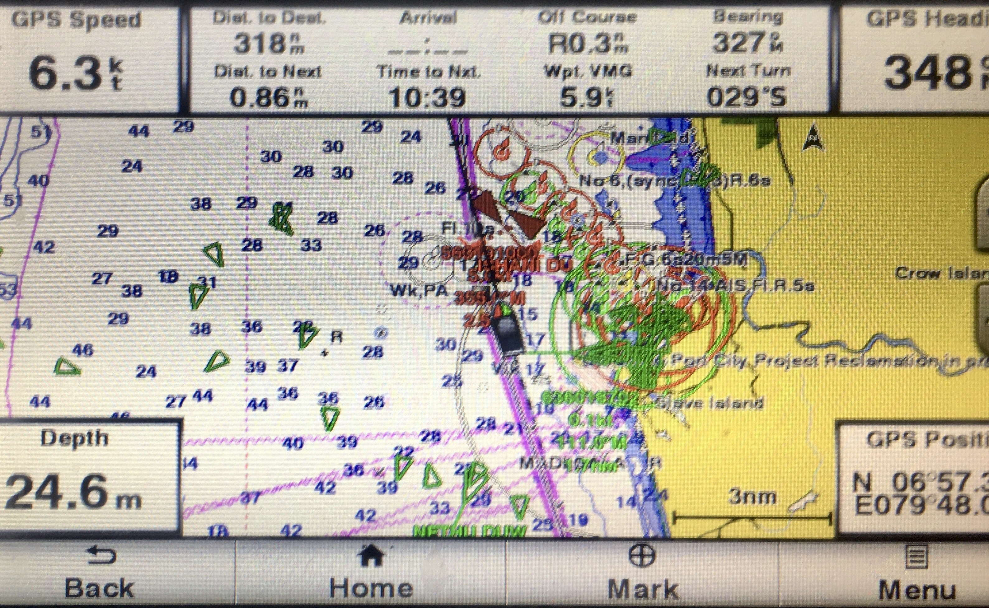 Plenty of traffic to avoid passing ColomboOn day 9, we left at first light and motor sailed up the coast which was in the lee of the prevailing winds. We reached the huge metropolis of Colombo with its impressive skyline of skyscrapers just on darkness and soon after lost our protection from the land and met the full force of the wind channeling down the Gulf.