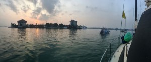 Anchored at Kochi quarantine with yellow flag announcing we’re waiting to clear in.We slept for a couple of hours and woke to find a port control boat nearby and immigration officials already on board the yacht anchored next to us.