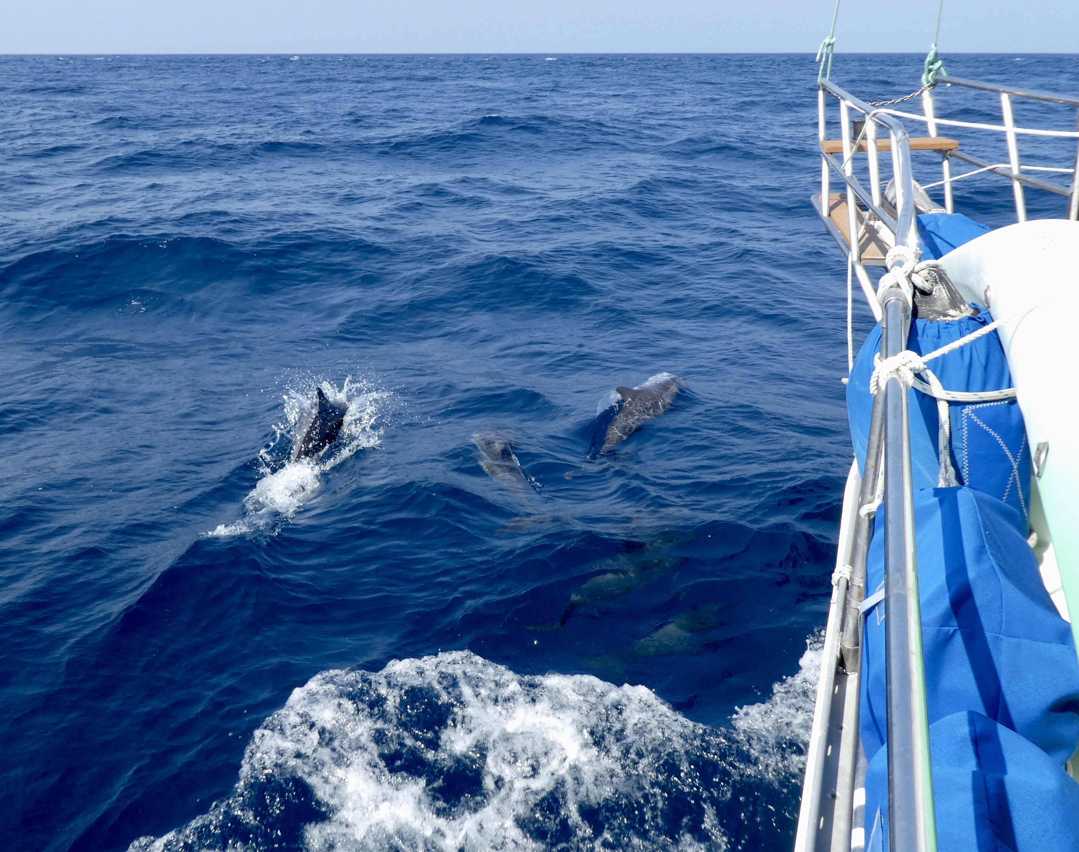 As if to wish us well on our way, a huge pod of small dolphins chose to came jumping across the waves to meet us and then frolicked back and forth across our bow wave for several miles before they disappeared into the horizon.