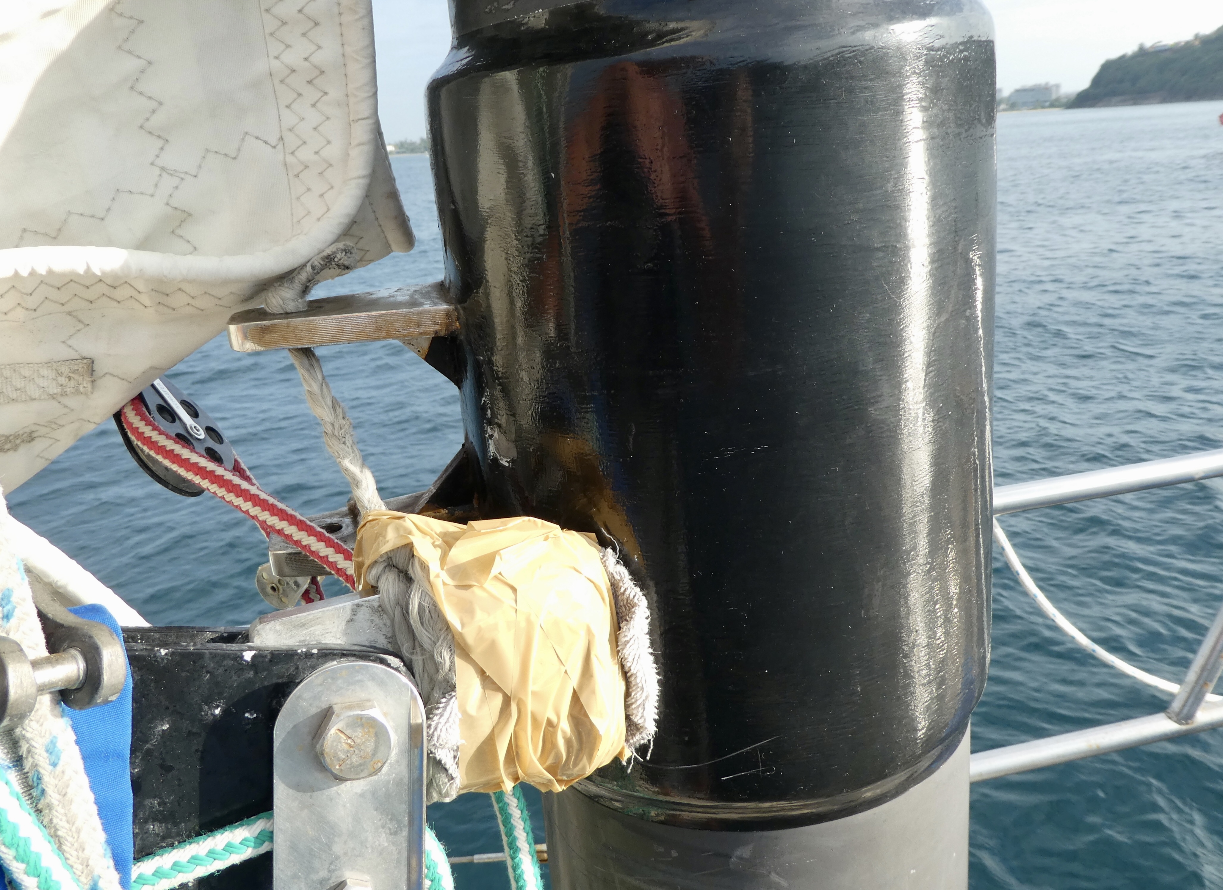 The broken gooseneck screw on the boom; bandaged up to avoid damaging the mast