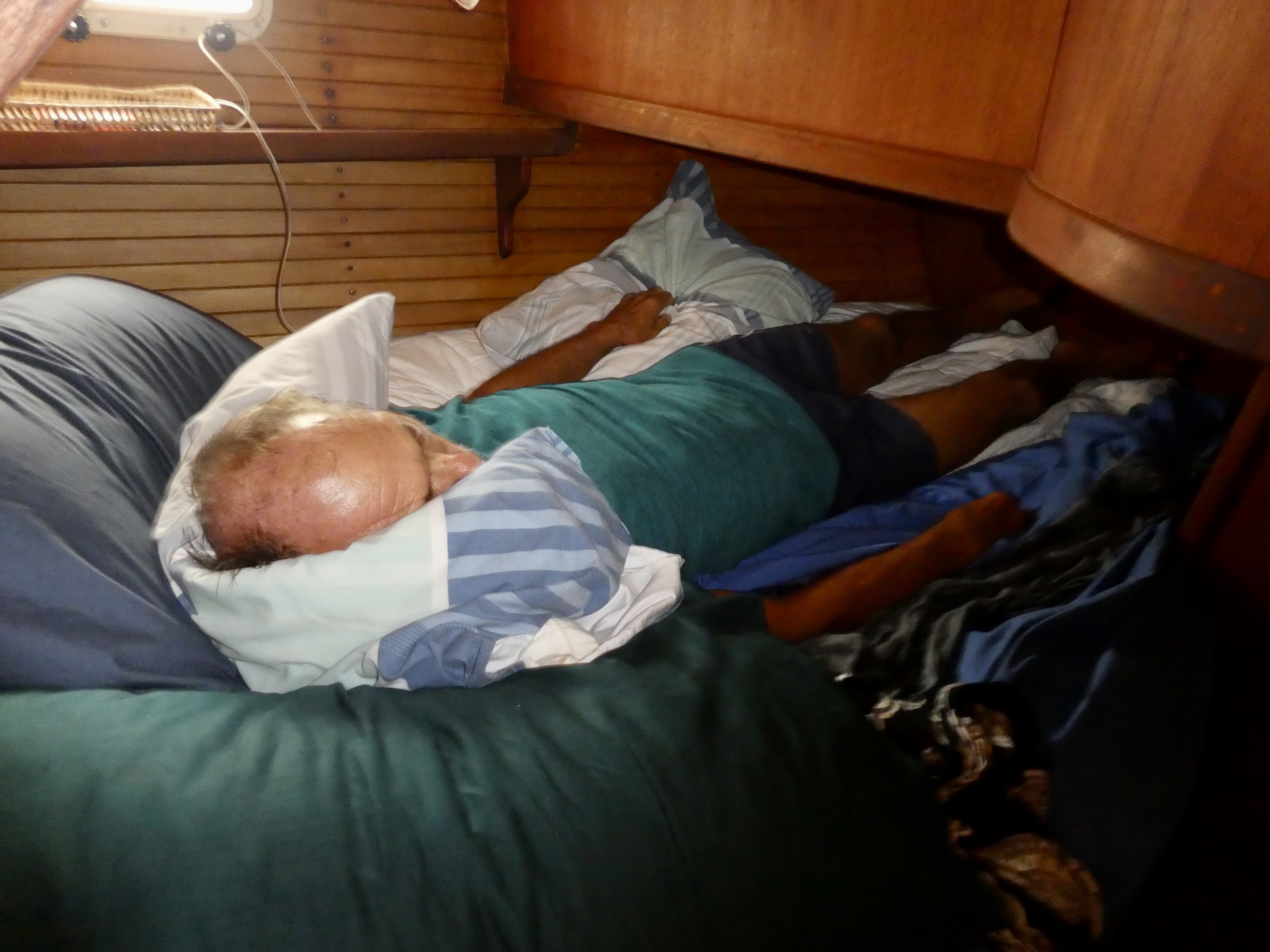 Frank all tucked in trying to sleepPlus we sleep a lot. Usually the first few days on a passage are the hardest, getting used to being on watch every few hours throughout the night, always feeling groggy and roly conditions often makes sleep harder, so we take it in turns during the day to catch up. It also passes the time and is a good strategy to build up our reserves in the eventuality that the next night might bring bad conditions and more broken sleep. This happens more than you would imagine.