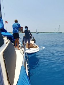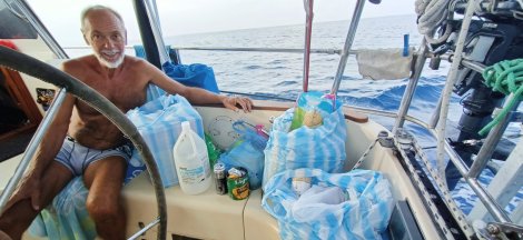 In the next hour or so, they lowered a wooden dinghy from the deck of their boat, came across to take all our empty jerry cans which they filled and brought back, along with two extra jugs of their own (over 180 litres in all), and a 20kg bag of small frozen fish thrown in as such a bonus kind offering.