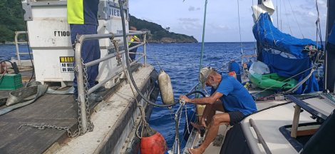 We hadn’t requested to clear into Christmas Island as we only planned to rest and refuel, and we had emailed ahead to alert them of out arrival. Due to the covid-19, we would be quarantined on board during our stay, so we checked in with border patrol and bio security over the VHF radio and later a barge with police and a doctor on board was lifted by crane from the jetty into the water to come out and check on our health and paperwork. They were most considerate of Frank’s condition and offered to take him to the hospital if needed, but Frank felt his smptoms had settled down well enough to not to require this. As long as he kept well hydrated, didn’t overheat and took it easy, he was managing his condition well enough now to wait until he could see his urologist back in Brisbane.
