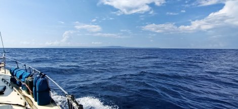 As dawn broke two days later, we could just make out land in the haze 30 miles away. The winds were starting to pick up significantly, so we were pushing into strong headwinds and didn’t arrive into Flying Fish Cove till late morning.