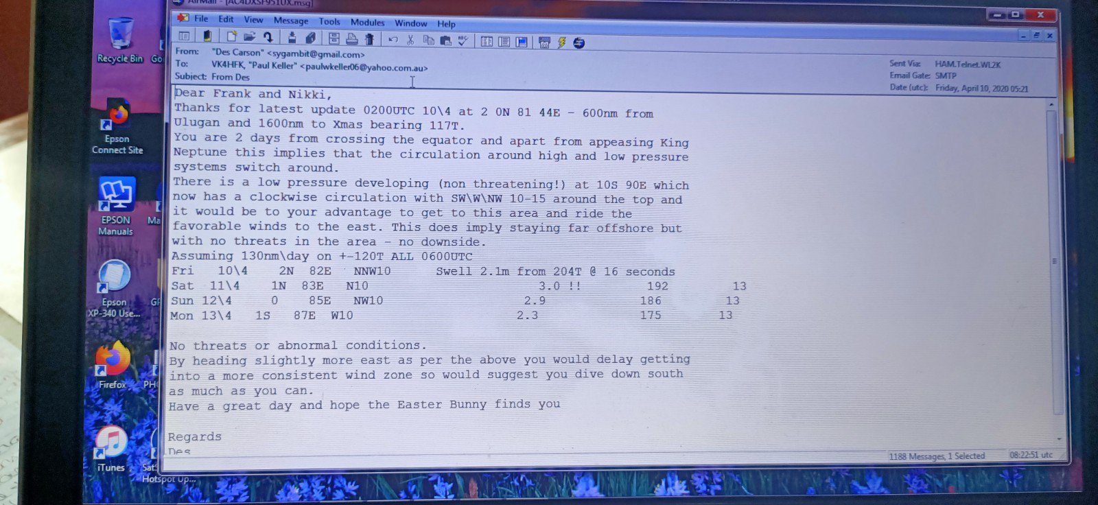 We had continuous problems connecting to the internet with our sat phone and a number of times had to send text messages to Paul asking him to forward emails for us.