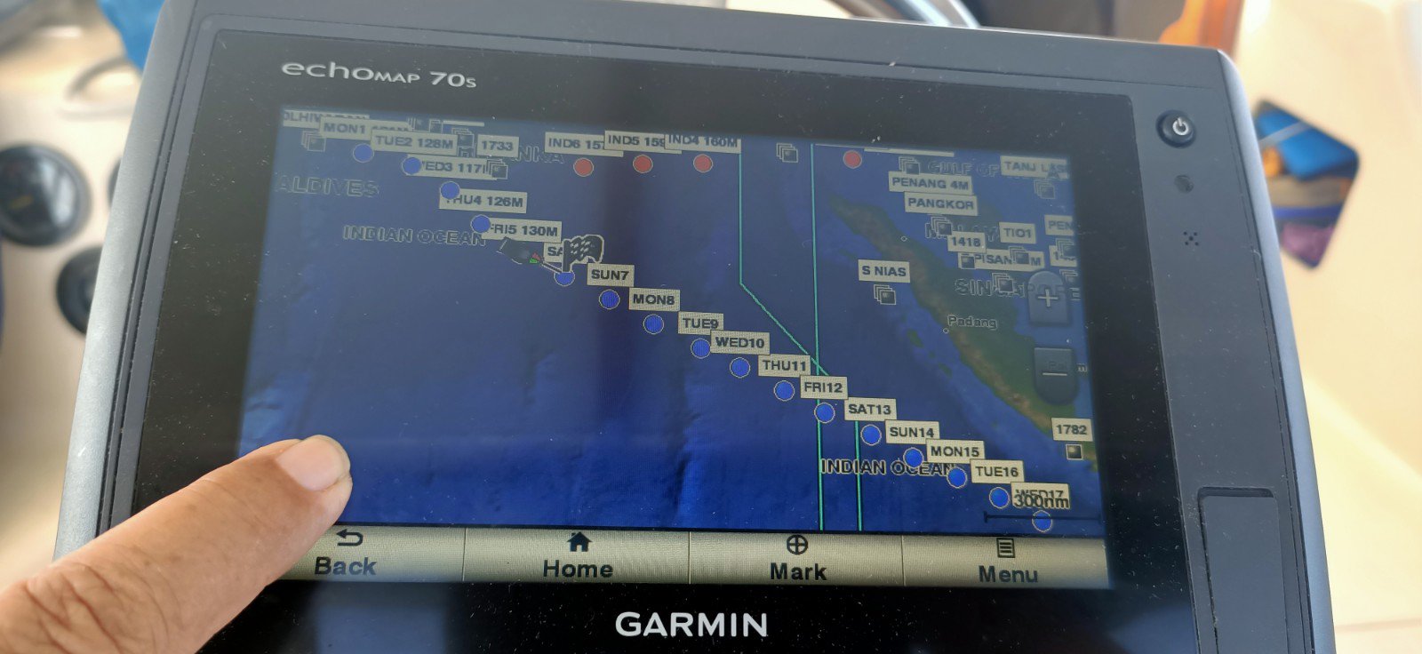 To try and catch what little wind there was, we planned to head almost due east from the Maldives, which took us only a hundred or so miles beneath Sri Lanka. Then we would gradually veer south east on a rhumb line directly towards Christmas Island.