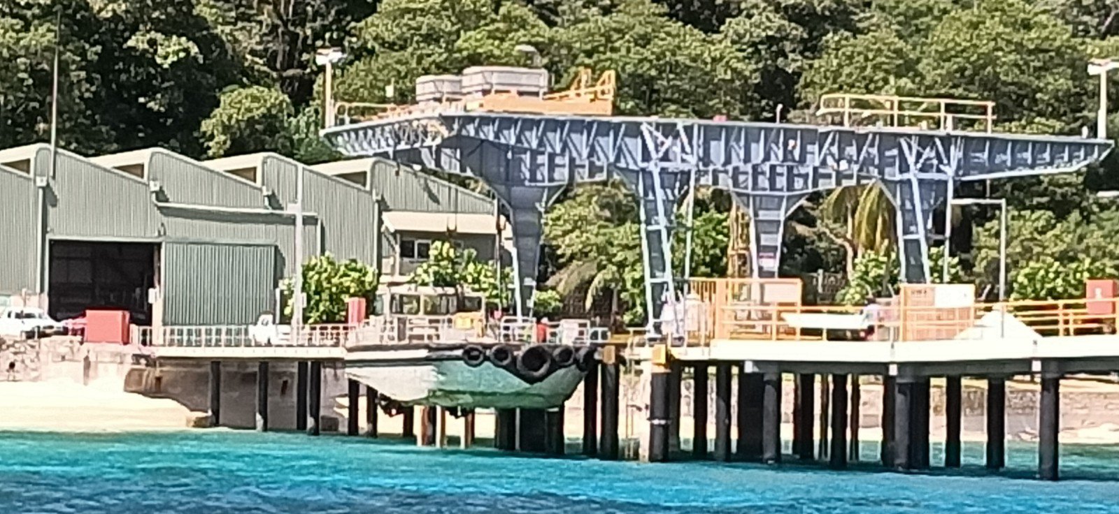 The stevedores told us how conditions get so bad in Flying Fish Cove during the monsoon that waves crash right over the top of the jetty. I guess this explains why there were no boats left permanently in the water and the barge would get lifted out after every single trip, even if it was going back out again a half hour later. At the end of each days activities, the barges would be lifted onto tracks on the jetty and rolled along into a large storage hangar.