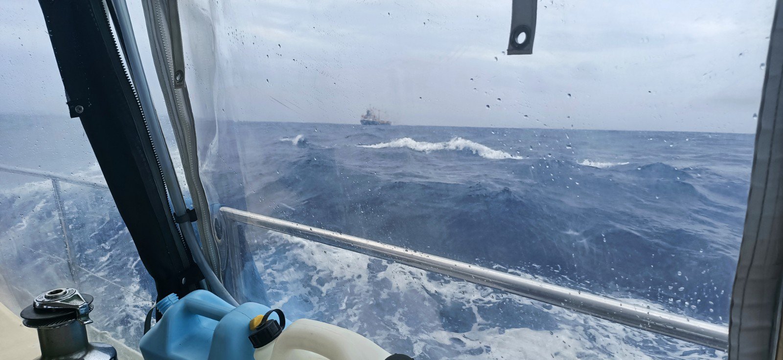 In the next hour or so, they lowered a wooden dinghy from the deck of their boat, came across to take all our empty jerry cans which they filled and brought back, along with two extra jugs of their own (over 180 litres in all), and a 20kg bag of small frozen fish thrown in as such a bonus kind offering.