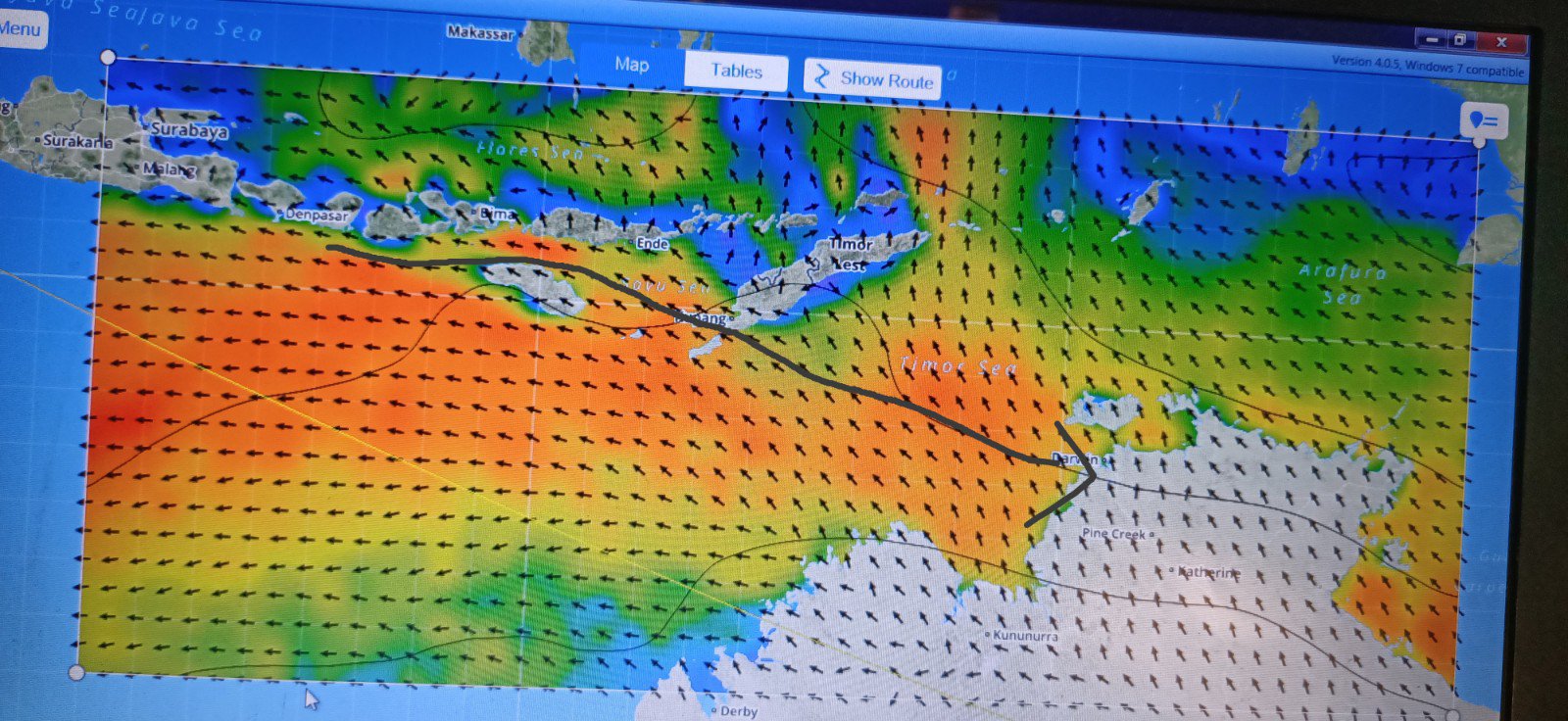 It was clear we would need to fight consistently strong headwinds all the way back to Darwin, but if our strategy worked, we could head up towards the coast of Java and stay in the lee of the Indonesian coastline where the winds seemed lighter and the land might some provide shelter from the swells.