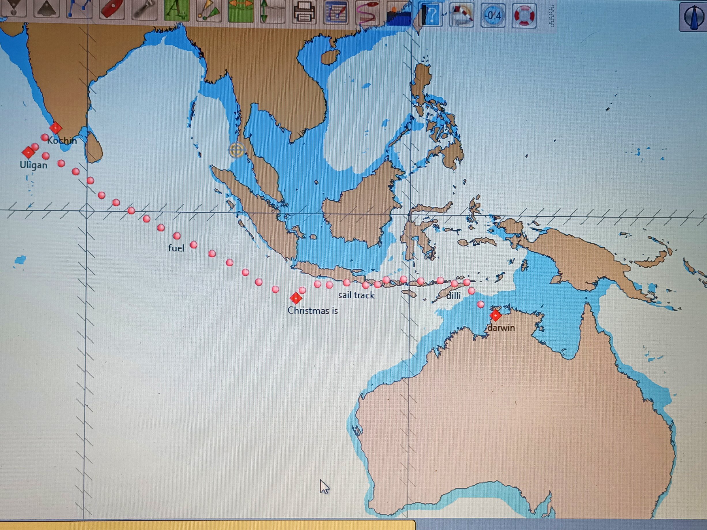 Our rhumb line with estimated daily runs from the Maldives to Christmas Island