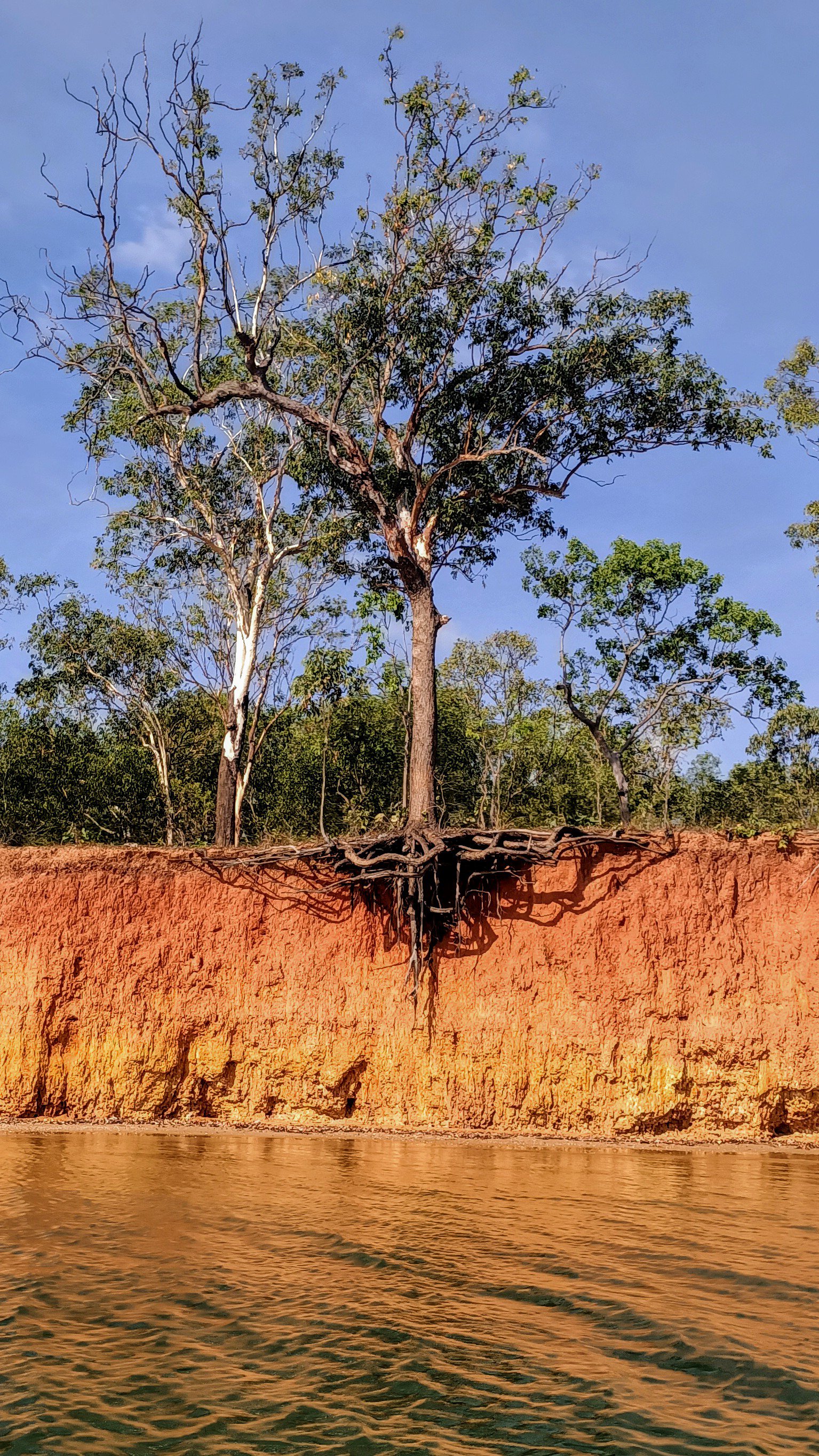 Some bays were protected by tall cliffs of deep red earth clinging steadfastly to the roots of age old trees leaning over balanced at precarious angles as wind and water eroded and threatened their future.  Amongst the muddy reaches of these bays, we saw dolphins and dugongs, reef sharks and turtles.