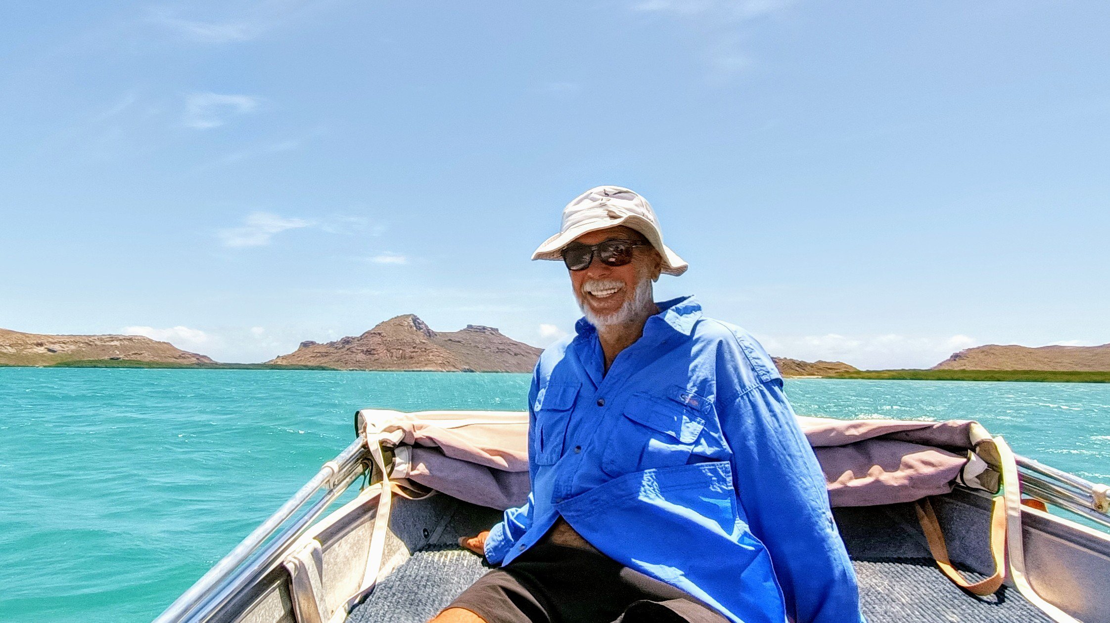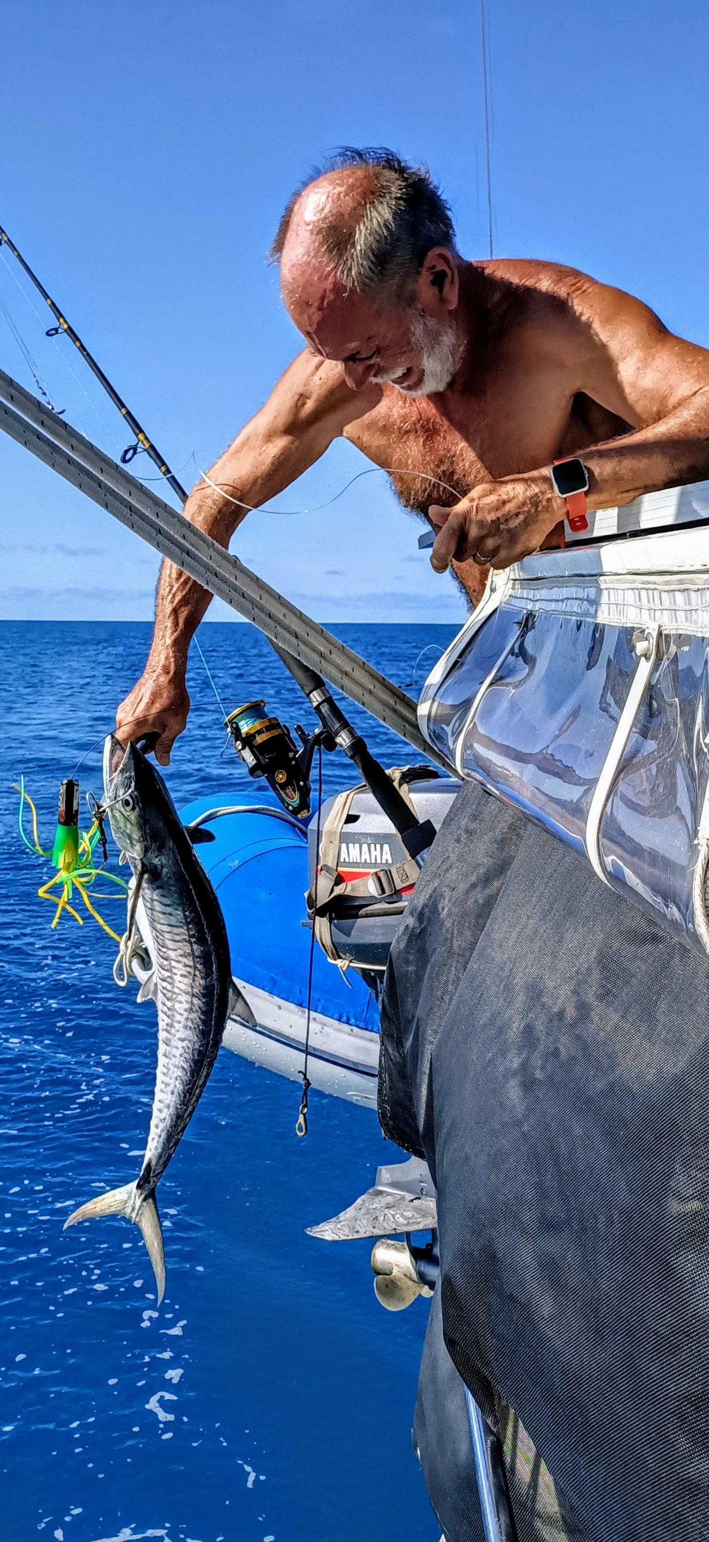 The strong winds picked up during the day, so by the time we motored back down the channel between the two islands, it was only John’s skills as an experienced surfer that prevented the dinghy broaching in the scary swells.