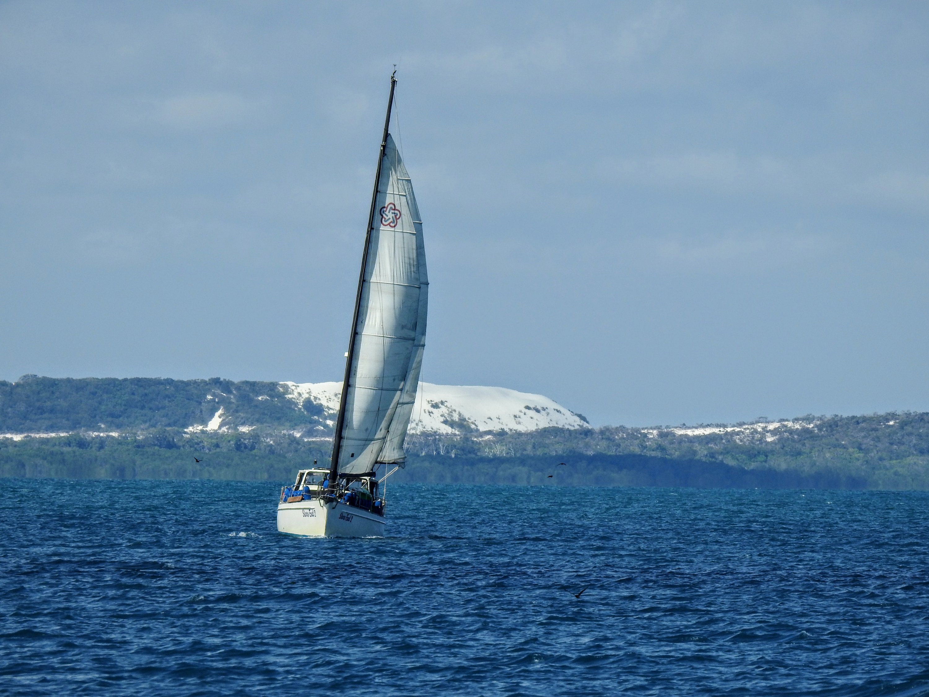 The coastline was very different now with impressive cliffs bordering vast stretches of white sandy beaches often fringed by headlands of rounded boulders resembling massive grey marbles. Promontories jutted out into the choppy waters for miles belying the treacherous submerged reefs lurking beneath their shallow depths. We still had to tack in a zig zag motion each day trying to make the most of the winds but also to wend our way between the many reefs, islands and commercial boats using the shipping channels.